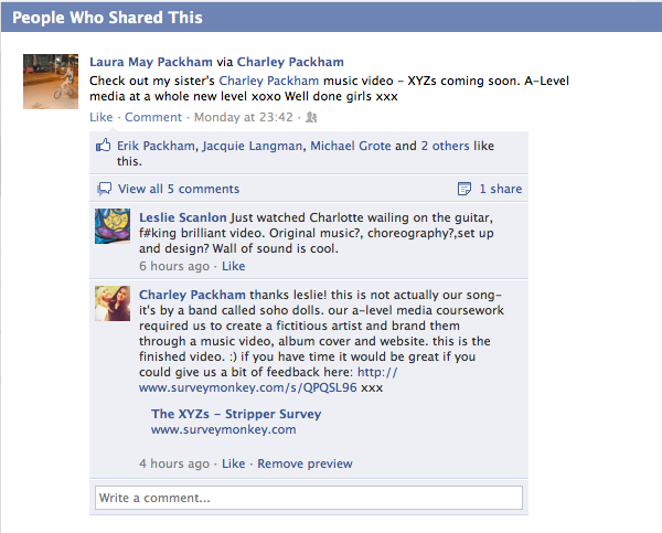Our target audience was predominantly teenage girls around the ages of 14-19 who would associate with the band aswell as finding them aspirational. We employed a multiplatform strategy in order to promote our video and gain feedback from our core target audience and a wider range of music fans and friends. Facebook (posts, shares and likes), Twitter (retweets), Youtube (views and data), Tumblr (notes and reblogs), Focus Groups, a Premiere Screening, web forums and and online questionnaire all helped us collect information on audiences opinions of our music video.