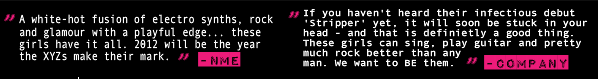 We really wanted to create a strong and powerful brand as well as band and decided up on a logo and rough colour scheme of black and pink to run throughout, with signifiers of the glam rock/ pop rock genre. Tying ourselves to a particular colour can be very effective, as noticed from earlier research into Joss Stone's album cover and demonstrated by band's such as The Pretty Reckless using black, white and red across their website and album.